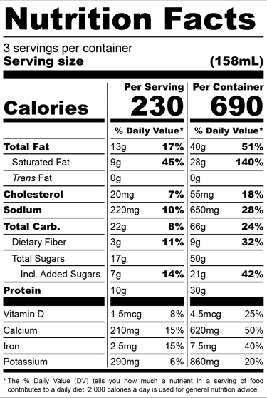 INGREDIENTS: WHOLE MILK, BANANAS, DARK CHOCOLATE CHIPS (UNSWEETENED CHOCOLATE, CANE SUGAR, COCOA BUTTER), VANILLA PROTEIN POWDER (PEA PROTEIN, ORGANIC CANE SUGAR, COCONUT CREAM POWDER, NATURAL FLAVOR), COCONUT CREAM POWDER, PURE ORGANIC MAPLE SYRUP, VANILLA EXTRACT (VANILLA BEAN, EXTRACTIVES IN WATER, ALCOHOL) (35%), SEA SALT